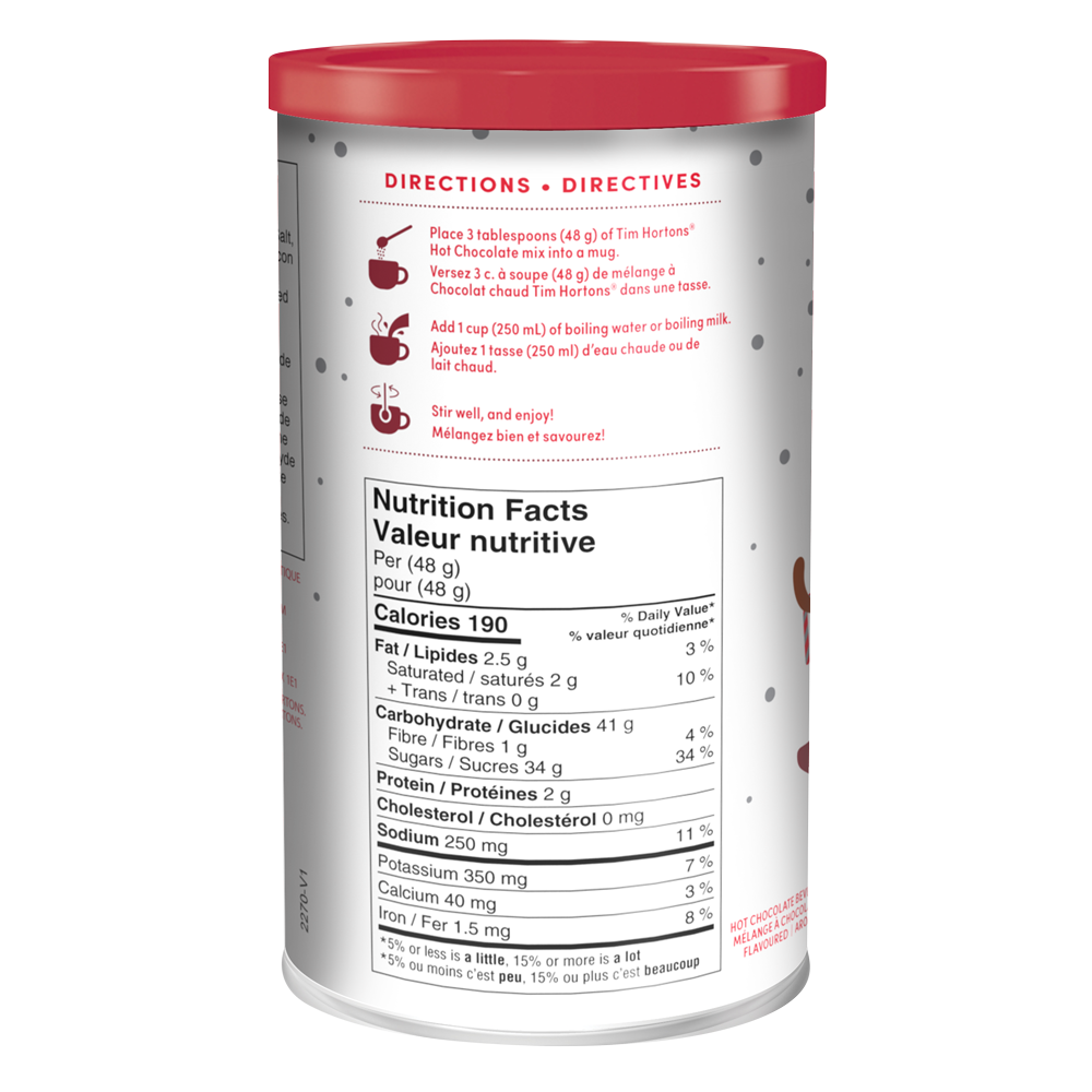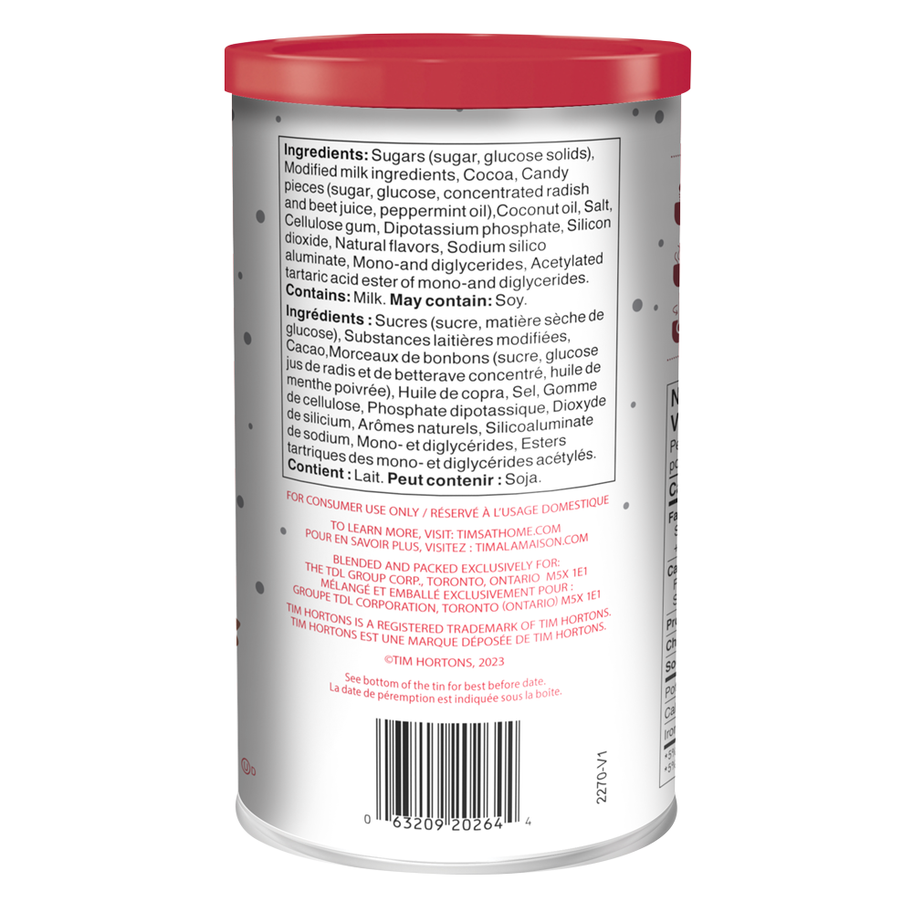 Tim Hortons Candy Cane Hot Chocolate is a delicious minty hot chocolate mix that includes real crushed candy cane pieces that melt into hot water or hot milk. creating the perfect sweet treat for the Holiday Season. Enjoy your favorite Tim Hortons Holiday beverage from the comfort of your own home.